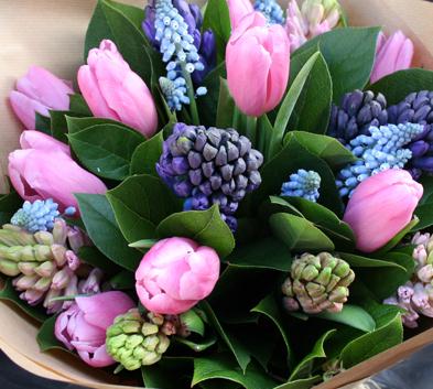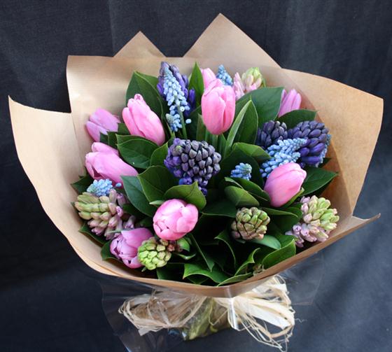Simply beautiful hyacinth and tulip spring fresh bouquet! Colours may vary depending on availability