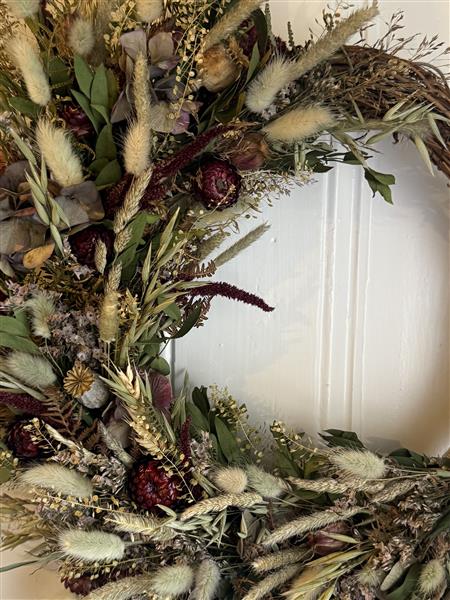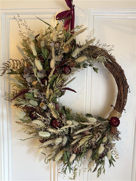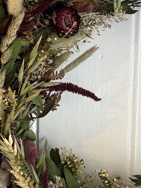 A beautiful meadowy wreath made up of grasses, Wheat, Limonium, Hydrangea, Poppy heads and cranberry Helichyrsum.