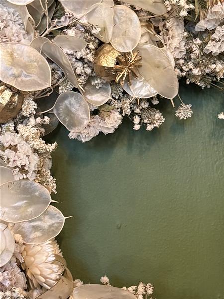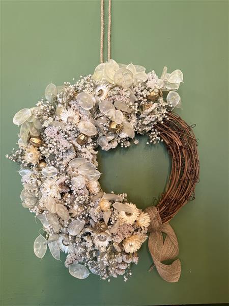 This stunning snowy white wreath is made up of Honesty, Statice, Gypsophila, Ami, helichrysum and gold poppy heads.